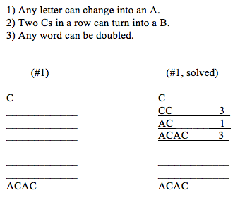 A second reason I use formal systems with my geometry students is that they provide a nice parallel to geometric transformations. When taking Felix Klein’s approach to geometry–that geometry is about transformations that leave certain properties of geometric objects invariant–it’s nice to have formal systems in the background. Invariants, shortest-paths, and just the basic notion of a step-by-step transformation all can arise from discussions of simple formal systems.