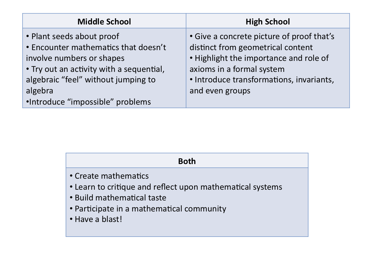 Very nice material. I’ve also considered using the Godel, Escher, Bach formal systems to introduce formal proofs. Seems like a good transition step.